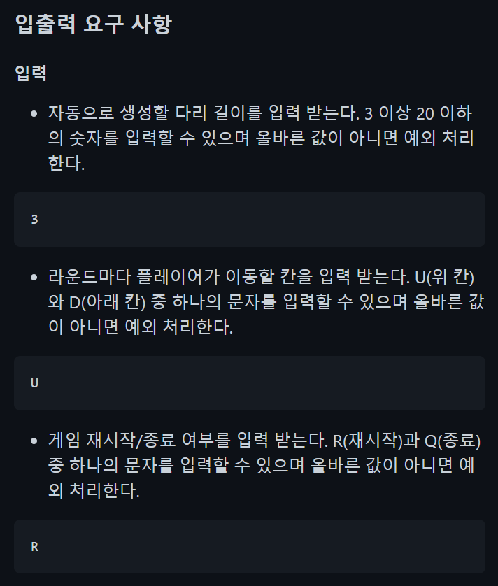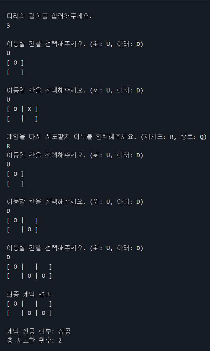 사용자로부터 다리의 길이, 이동할 칸 (U or D), 게임을 다시 시도할지의 여부를 입력받아