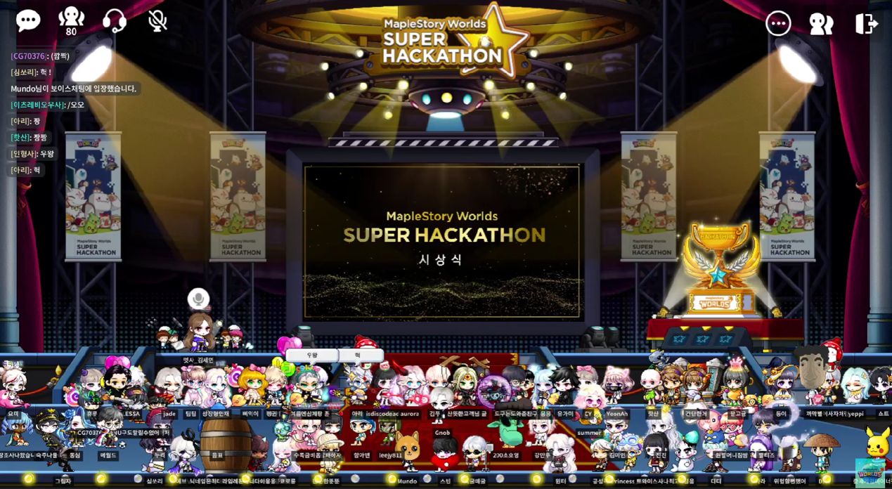 시상식 뒷풀이 맵에서도 모든 참가자들의 월드 썸네일이 펼쳐졌다. 기다리던 중 우리 팀의 '던전 메이플'도 볼 수 있었다.