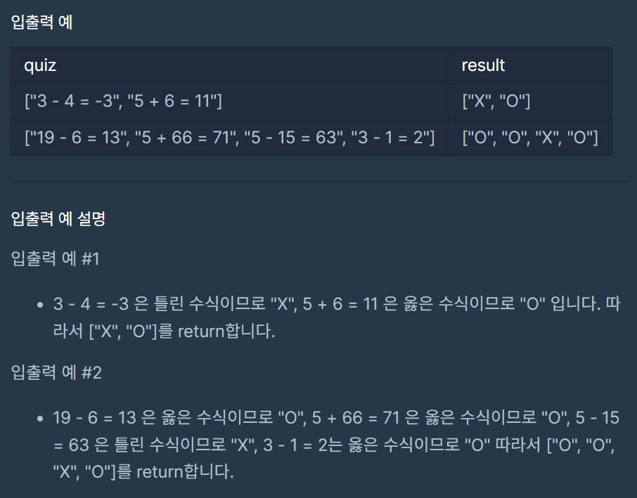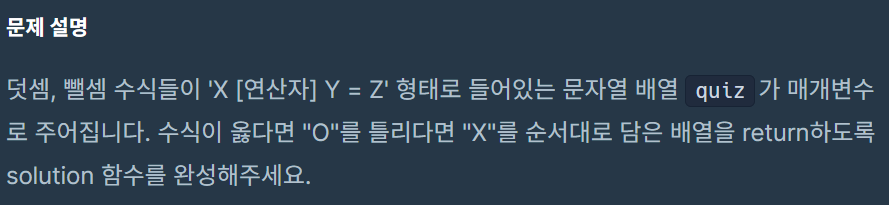 덧셈, 뺄셈 수식들이 'X [연산자] Y = Z' 형태로 들어있는 문자열 배열 quiz가 매개변수로 주어집니다. 수식이 옳다면 "O"를 틀리다면 "X"를 순서대로 담은 배열을 return하도록 solution 함수를 완성해주세요.