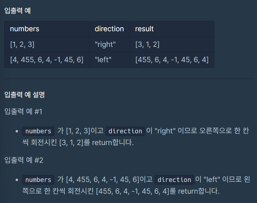 정수가 담긴 배열 numbers와 문자열 direction가 매개변수로 주어집니다.