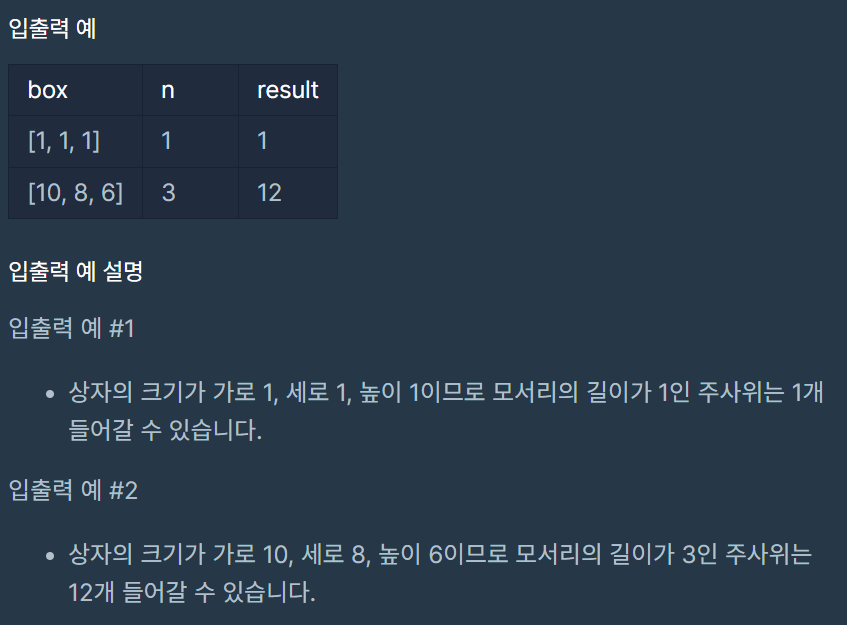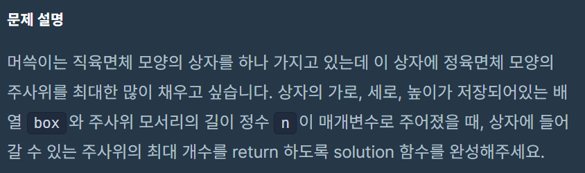 상자에 들어갈 수 있는 주사위의 최대 개수를 return 하도록 solution 함수를 완성해주세요.
