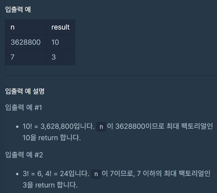 // 이 팩토리얼 값이 n보다 커지는 순간 max에 값을 저장하고 break