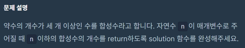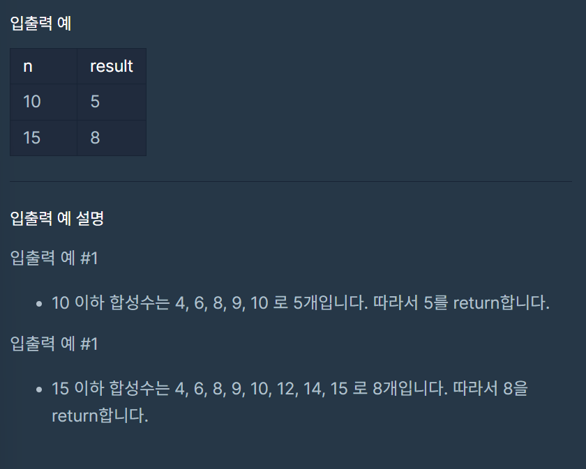자연수 n이 매개변수로 주어질 때 n이하의 합성수의 개수를 return하도록 solution 함수를 완성해주세요.
