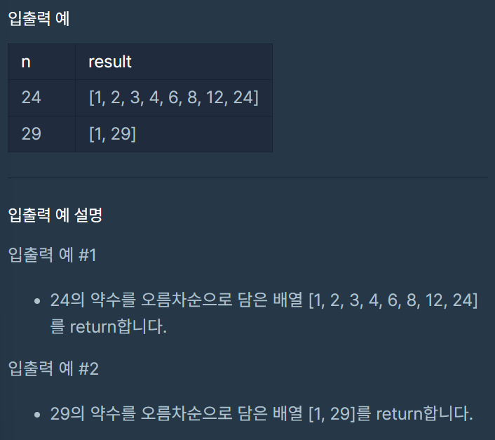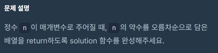 n의 약수를 오름차순으로 담은 배열을 return하도록 solution 함수를 완성해주세요.