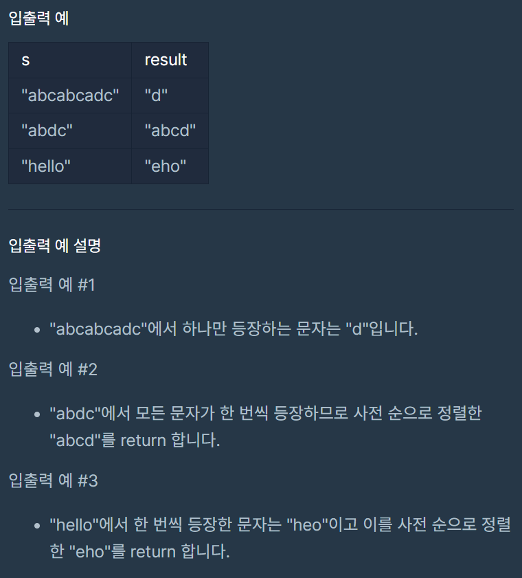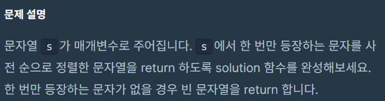 ❤️ Problem 더보기 문제 문자열 s가 매개변수로 주어집니다. s에서 한 번만 등장하는 문자를 사전 순으로 정렬한 문자열을 return 하도록 solution 함수를 완성해보세요. 한 번만 등장하는 문자가 없