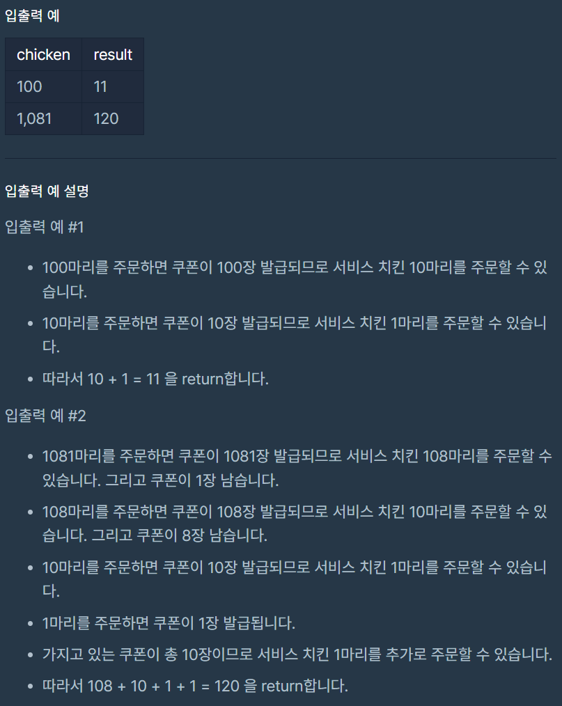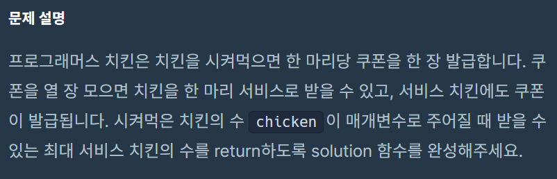 프로그래머스 치킨은 치킨을 시켜먹으면 한 마리당 쿠폰을 한 장 발급합니다.