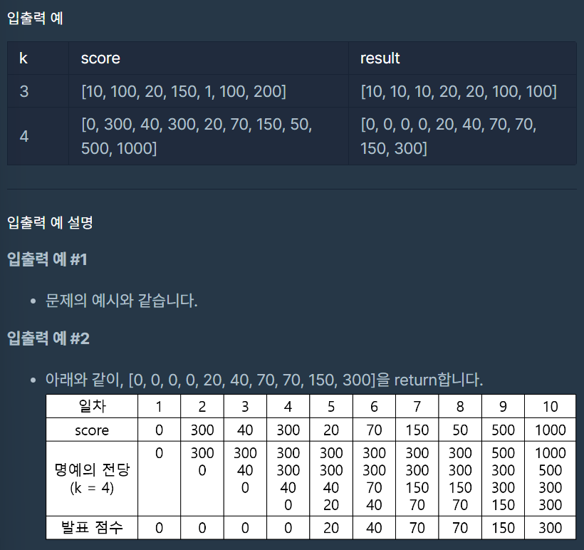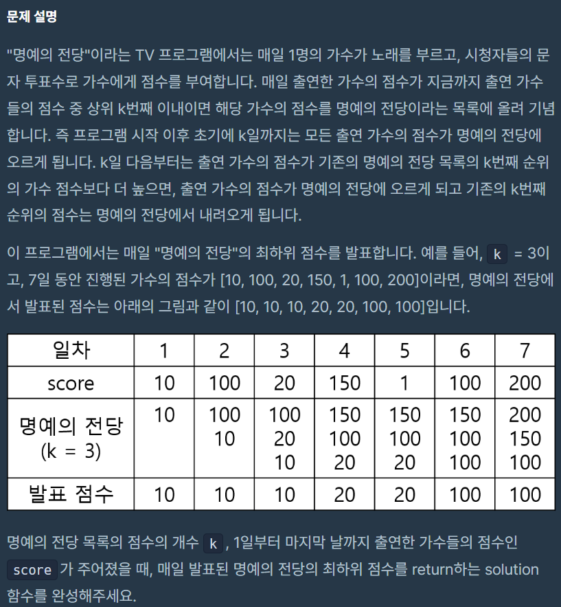 매일 발표된 명예의 전당의 최하위 점수를 return하는 solution 함수를 완성해주세요.