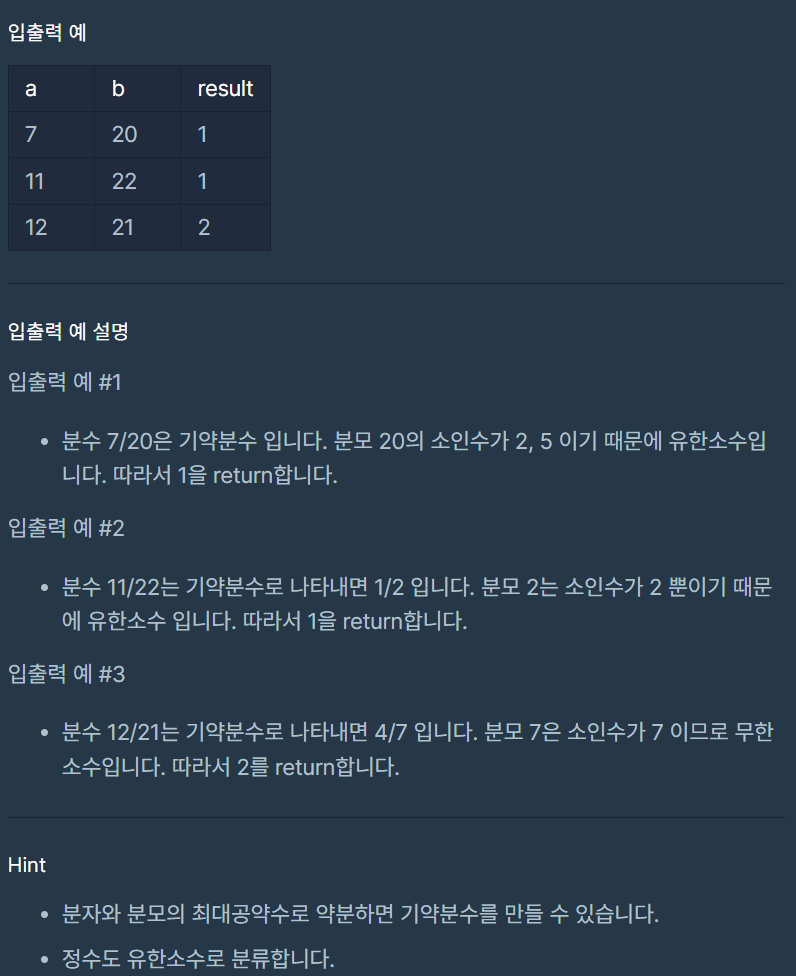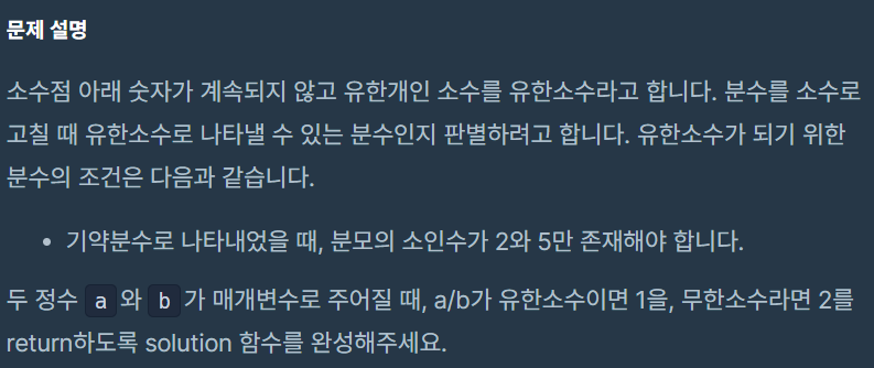분수를 소수로 고칠 때 유한소수로 나타낼 수 있는 분수인지 판별하려고 합니다.
