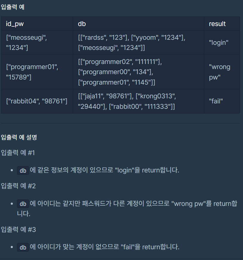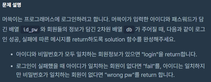 머쓱이가 입력한 아이디와 패스워드가 담긴 배열 id_pw와 회원들의 정보가 담긴