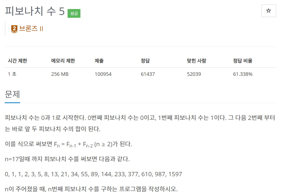 피보나치 수는 0과 1로 시작한다. 0번째 피보나치 수는 0이고, 1번째 피보나치 수는 1이다.