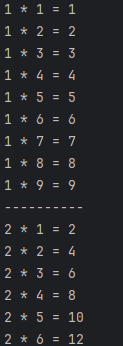 구구단을 한눈에 보기 쉽게 가로로 출력한 실습입니다.