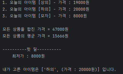 - 임의의 상품을 정하고, 고른 아이템의 이름과 가격을 출력하는 출력문을 작성합니다.