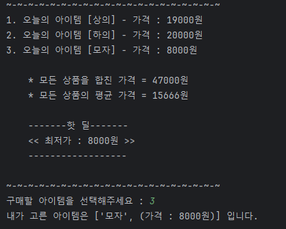 - default 처리로 아이템을 벗어나는 번호가 입력되면 다시 while문으로 돌아가 반복을 진행합니다.