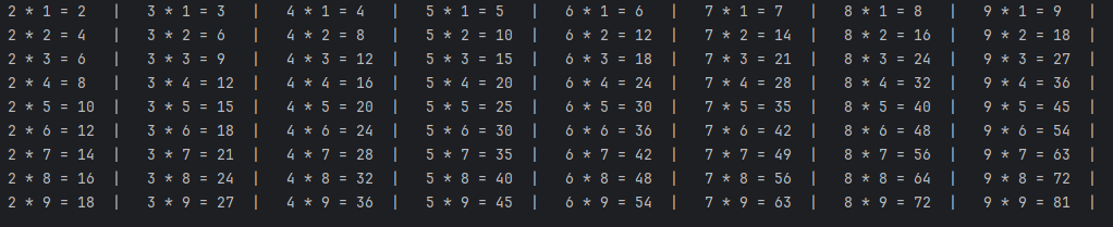System.out.print(j + " * " + i + " = " + (j*i) + "\t|\t");