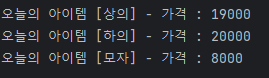 - ItemForArray[]로 아이템 배열을 만들고, item[0] = new ItemForArray(19000, "상의"); 와 같이