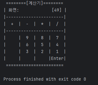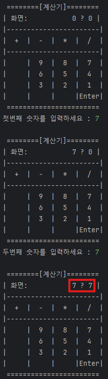 - printScreen() : 숫자 입력, 연산자 입력이 수행될때마다 계산기의 화면을 출력하여, 사용자에게 보여줍니다.