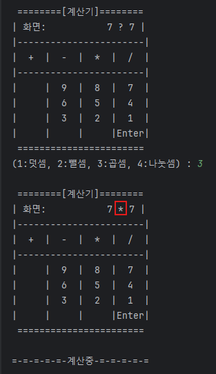 System.out.println("\n=-=-=-=-=-계산중-=-=-=-=-=\n");