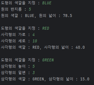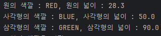 System.out.println("삼각형의 색깔 : " + t2.getColor() + ", 삼각형의 넓이 : " + String.format("%.1f", t2.getArea()));