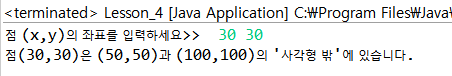 System.out.print("점("+x+","+y+")은 (50,50)과 (100,100)의 '사각형 밖'에 있습니다.");