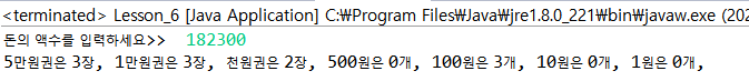 돈의 액수를 입력받아 오만원권, 만원권, 천원권, 500원짜리 동전, 100원짜리 동전, 10원짜리 동전, 1원짜리 동전 각 몇 개로 변환되는지 출력하라. (Scanner, if문 연습)