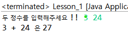 System.out.println(a+" + "+b+ " 은 " +sum); // a,b,sum 순서로 출력하지만 중간 +를 문자로 출력한다.