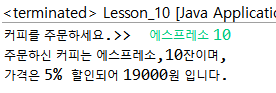 실습 문제 8번을 변형해보자. 에스프레소의 경우 10잔 이상을 주문하면 가격의 5%를 할인해준다.