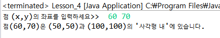 System.out.print("점("+x+","+y+")은 (50,50)과 (100,100)의 '사각형 내'에 있습니다.");