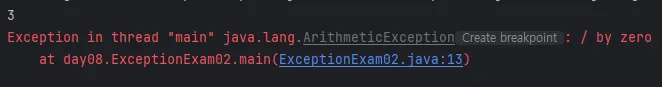- e.printStackTrace(); : 메소드로 어느 부분에서 예외가 발생했는지 빨간 줄로 표시