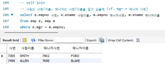 - ex. 테이블은 하나지만 EMPLOYEES테이블에는 사원과 매니저 정보가 들어있으므로