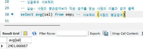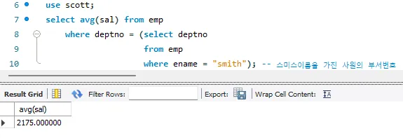 - 계산결과를 이용하여 외부 쿼리의 where절을 검사한다.
