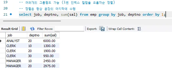 - 여러개의 그룹핑도 가능하며, 정렬은 문장 마지막에서 수행