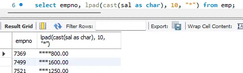 - sal (급여)를 char형으로 바꿔주고, 급여 왼쪽에 *로 채운 후 총 10자리를 출력하는 예제이다.
