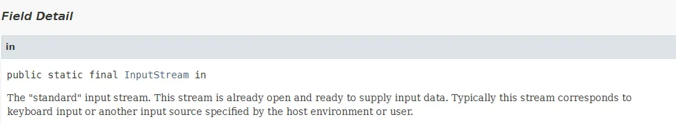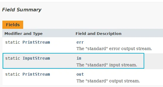 - System.in : 키보드와 연결된 System 클래스의 InputSteam 타입의 static final 상수를 의미