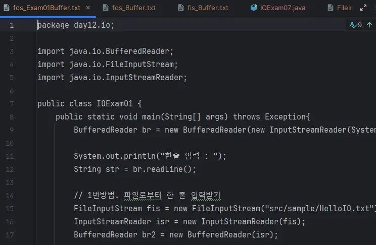 - BufferedReader를 사용해서 한 줄을 입력받게 하고, 그 매개변수로 FileReader 인스턴스를 만든다.