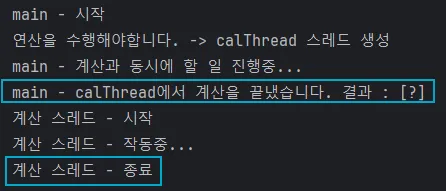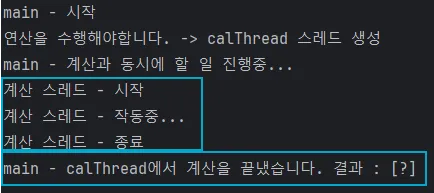 - main의 MyThread호출 과 콘솔출력, MyThread의 start()로 인한 run()호출로 콘솔출력