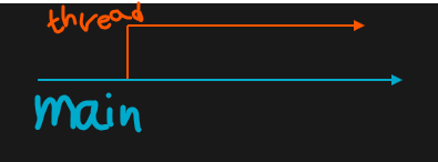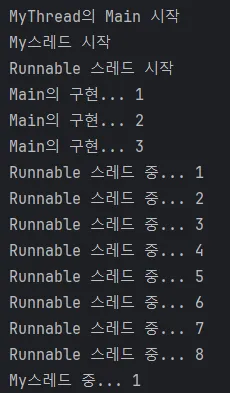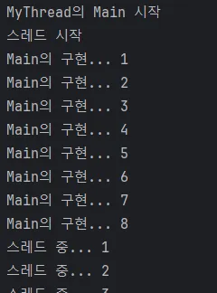 - myThread.start()로 인해 main의 수행흐름에서 가지를 쳐서 새롭게 수행흐름을 만들어냄 (수행흐름이 2개)