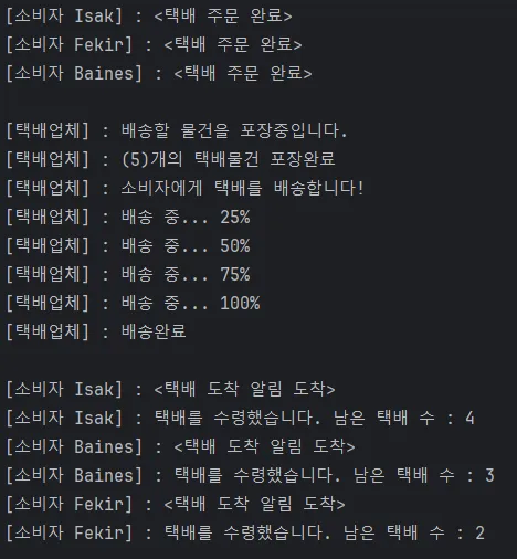 - 배송할 아이템 수를 static 변수로 받고, 배송업체 스레드가 실행되면서 배송개수를 늘린다.