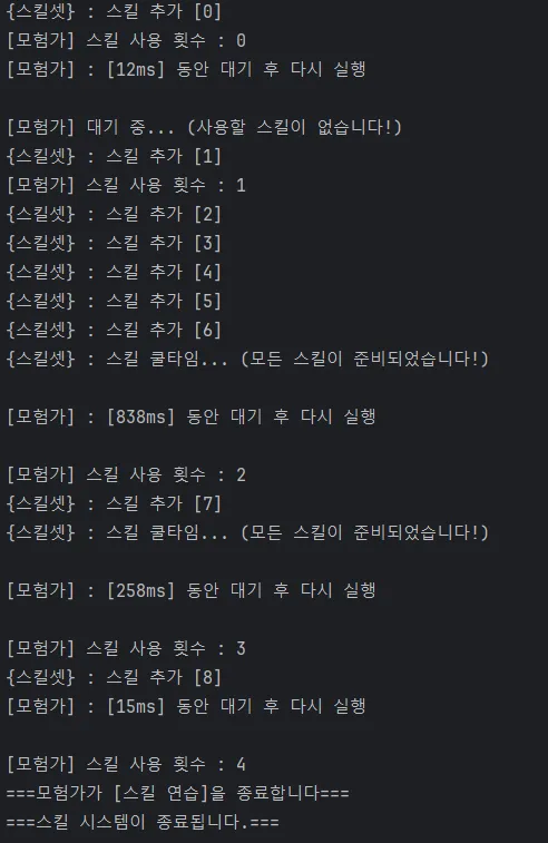 - 모험가의 스킬 사용이 스킬셋에 남아있는 스킬보다 많을 경우 "사용할 스킬 없다" 출력