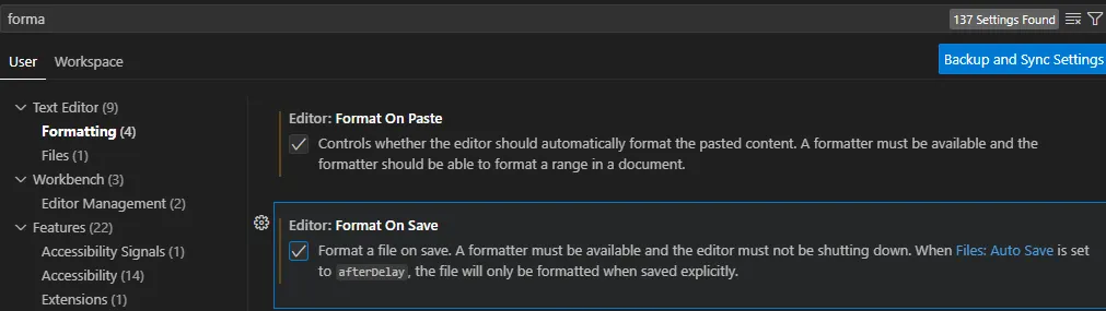 → 왼쪽 밑 Settings → formatting → Editor Paste, save 체크 (저장, 붙여넣을때 자동으로 formatting을 맞춰줌)
