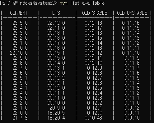 - nvm list (혹은 nvm ls) : nvm 설치 완료 후 list 확인 ➡️출력 : 22.12.0