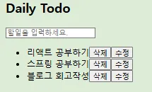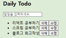 🚀30일차에는 리액트로 Todo리스트를 구현하면서 추가, 삭제, 수정 기능을 어떻게 구현하면 좋을지 배울 수 있었다.