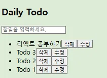 - express서버의 데이터를 리액트 Todo 프로젝트에 적용한 최종 결과이다.