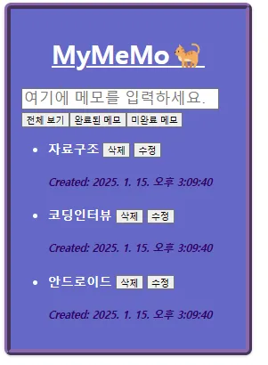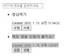 그 후 리액트로 구현했던 Todo 리스트 프로젝트를 조금 더 개선하여 "작성날짜"와 "할일완료유무" 등을 확인할 수 있도록 Memo 프로젝트를 진행하였다.