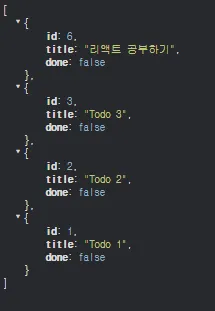 ➡️백엔드 서버를 재부팅하면 “리액트 공부하기”와 같은 데이터는 사라질 것이다.(=메모리에 저장되어있는 형태)
