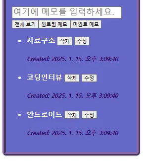 - 전체보기 / 완료된 메모 / 미완료 메모 에 대한 필터링을 수행하기 위한 컴포넌트