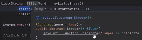 - Predicate를 받아들이며 filter의 조건을 boolean형으로 판단하고 Stream으로 반환