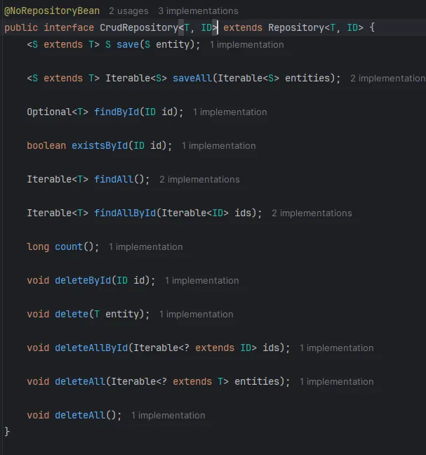 - 상속받는 CrudRepository 인터페이스에 들어가보면