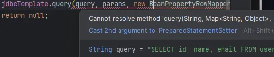 List<User> users = jdbcTemplate.query(query, params, new BeanPropertyRowMapper<>(User.class));