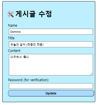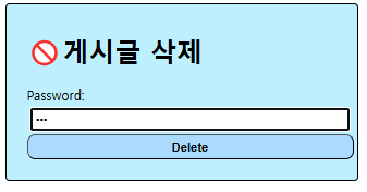 - 기존 친구목록 삭제에서는 데이터가 바로 삭제되었다면 게시판의 삭제는 비밀번호로 유효성 검증을 한 후 삭제하도록 구현