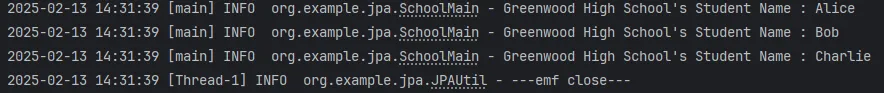 ➡️첫 log.info()를 통해 id=1번에 해당하는 학교 이름인 Greenwood High School 을 가져옴 - Greenwood High School's Student Name : Alice